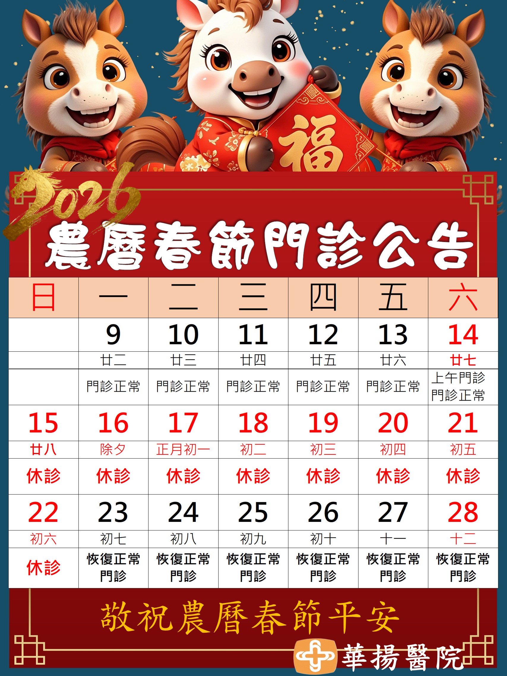 🔹 2/15(日)至 2/22(日):全部門診休診