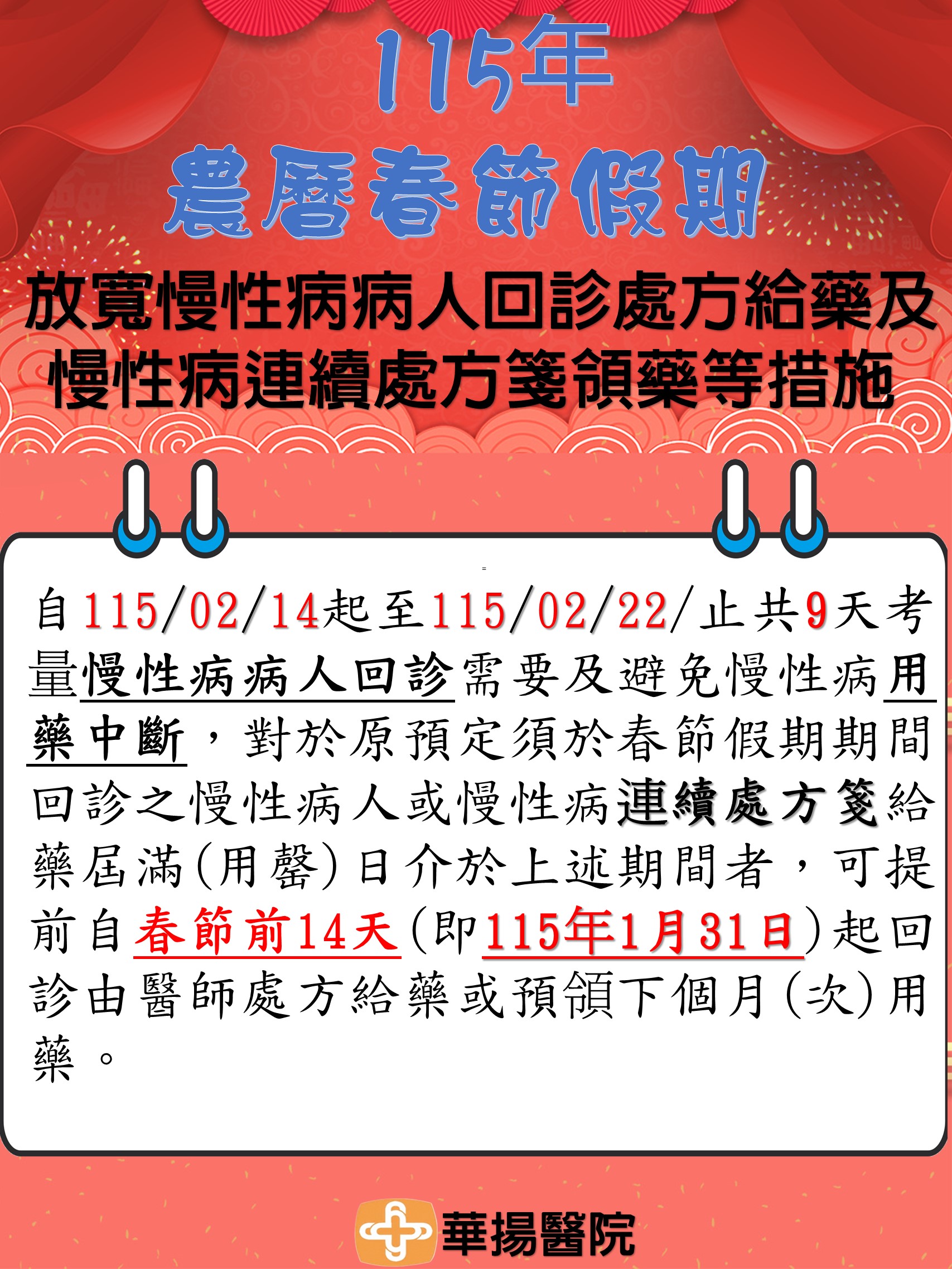 📍 詳情請洽本院門診或藥局櫃檯,確保慢性病治療不中斷,讓您安心過好年。華揚醫院祝大家新年快樂~