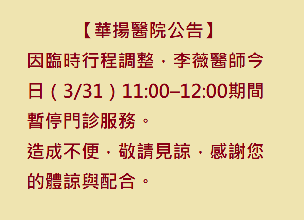 【門診異動公告|3/31 即時通知】11:00~12:00期間李薇醫師暫停門診服務